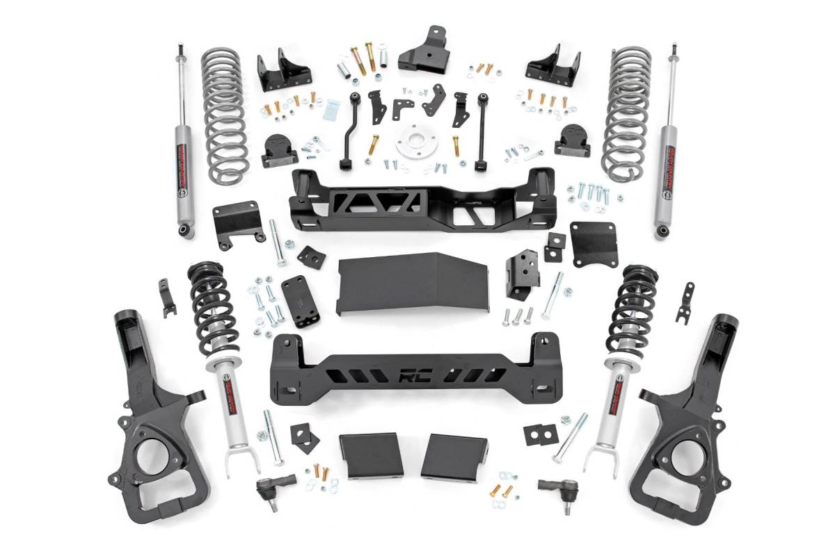 - Explore New Heights. Ram's updated fifth generation 1500 features an impressive all-new design that's built from the ground up, with aggressive angles and head-turning stylings that fit in beautifully when transformed with Rough Country's 6-inch Suspension Lift. Innovative Design and Construction. When changing a vehicle's suspension, the key to preserving ride quality is keeping the geometry of all suspension components as close to their factory angles as possible. This suspension kit combines the use of durable steel knuckles, differential brackets, and drop cross members to reduce cv angles and simulate factory angles all while achieving new heights. Featuring a set of upper strut spacers that offer uncompromised strength and rigidity, gaining lift height is no issue. Completing the rear of this suspension kit is a set of rear coil spacers, track bar relocation bracket, and sway bar links that allow you to retain factory-like geometry. This combined setup provides enough clearance to run 35" tires without additional modifications. Installation. With minor cutting and a strut compressor required to install, an estimated timeframe of 7-8 hours is recommended to complete this full installation. This full kit can be installed at home and can be completed efficiently and quickly! Limited Lifetime Replacement Warranty. Rough Country's 6" Suspension Lift Kit is backed with a limited lifetime replacement warranty towards manufacturer defects. As such, the product is protected from structural and workmanship damage after the date of purchase. With our industry-leading warranty give yourself peace of mind when using Rough Country's Suspension products!