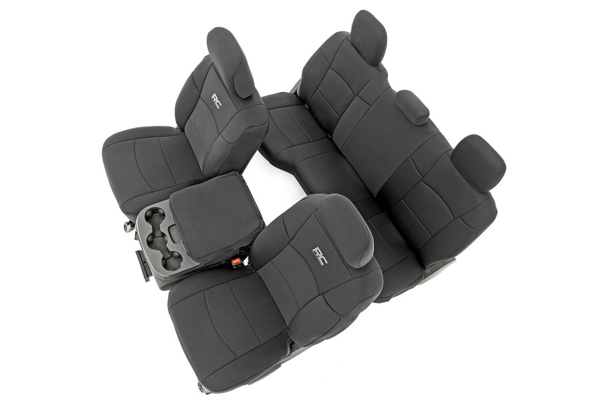 - Want to protect your seats or are your seats showing signs of wear and tear from daily use? Say goodbye to unsightly stains and deterioration with Rough Country's Neoprene Seat Covers - the ultimate solution for preserving your vehicle's interior. Snug Fit for Optimal Protection: Our seat covers are tailored to fit your seats perfectly, providing a protective barrier against spills, scratches, and everyday wear and tear. Factory-Spec Construction: Engineered to meet factory specifications, our covers blend seamlessly with your vehicle's interior, giving it a fresh, new look without compromising on quality or style. Four-Layer Defense: With a four-layer construction featuring foam padding and a durable polyester shell, our seat covers offer unmatched protection and longevity, ensuring your seats stay looking new for years to come. Breathable and Water-Resistant: The neoprene layer not only provides breathability for added comfort but also boasts water-resistant properties, safeguarding your seats from spills and stains. Complete Coverage: Our covers come with full protection for your front seats, including headrest covers where applicable, as well as rear covers to shield your back seats from children and pet-related mishaps. Peace of Mind Warranty: Rest easy knowing your purchase is backed by our two-year warranty, giving you confidence in the durability and reliability of our product. Don't let worn-out seats diminish your driving experience. Upgrade to Neoprene Seat Covers today and enjoy a fresh, stylish interior that's protected against the rigors of daily life on the road.