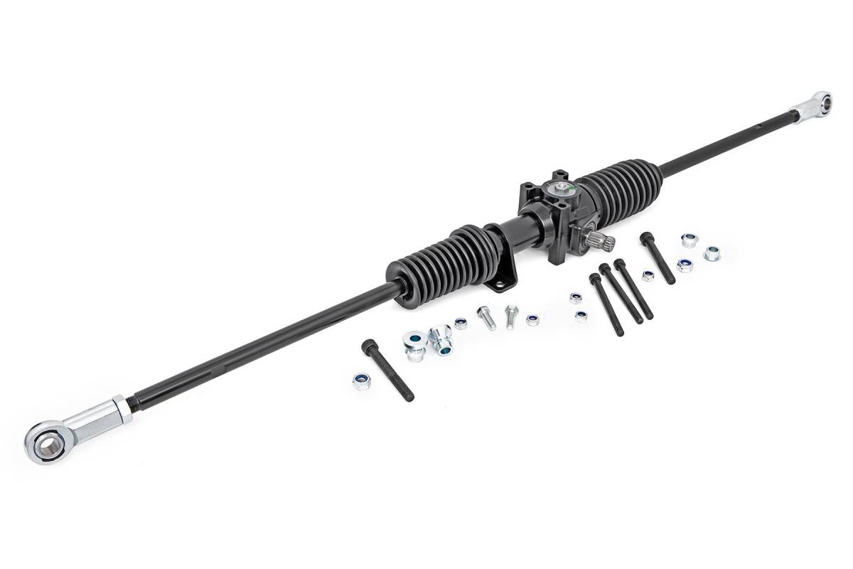 - Don t let poor steering lead you in the wrong direction. If you're looking for a sturdy rack and pinion system that'll steer your UTV in the direction you want, look no further than our upgrade for the Polaris Ranger. Your Ranger is built for hard work and off-road adventure, but utilizing your rig to its full potential can lead to sloppy steering. Our heavy-duty rack and pinion kit is designed to provide precise steering so you can navigate any terrain with ease. Heavy-Duty Design. Rough Country's new Rack and Pinion Kit for the Polaris Ranger is a unique, durable design that outperforms the stock OE. Utilizing a 22mm connecting shaft and 18.8mm spline diameter, this unit is sure to tackle any terrain. Boasting a black e-coat Rough Country's Rack and Pinion not only looks good but is corrosion and chip resistant! You will experience a smoother, more responsive ride thanks to our upgraded features. Installation and Warranty: Our Rack and Pinion Kit comes with the hardware you need for easy installation. Rough Country's industry-leading limited warranty is included for your peace of mind.