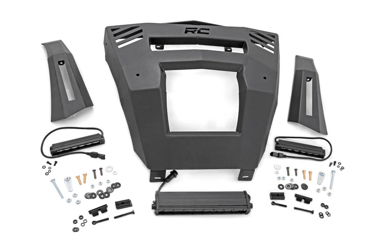 - Superior Function. Enhance the look and capabilities of your Can-Am Defender's front end with Rough Country's Front Bumper Kit with optional 6" or 12" LED Lights. This innovative add-on installs easily while following the factory body lines giving your UTV a more menacing appearance and additional front-end illumination. Innovative Design. These durable 1/8" steel panels offer a sleek, modern look that extends to the edge of the front-end assembly. Each side panel holds a 6-inch Rough Country Slimline LED Lightbar providing 2,880 lumens of off-road lighting. Additionally, the center will contain a 12" Lightbar offering 4,800 lumens so you can always see the trail ahead. Encased in an IP67 waterproof housing, Rough Country's LED lights are engineered to tackle tough terrain and withstand the elements. Installation. Featuring a 100% bolt-on installation process, an estimated timeframe of 3-4 hours is suggested to complete this installation. With the included step-by-step instructions this high-quality unit can be installed at home using standard tools and can be completed efficiently and quickly! Limited Lifetime Replacement Warranty. Rough Country's Front Bumper Kit is backed with a limited lifetime replacement warranty towards manufacturer defects. As such, the product is protected from structural and workmanship damage after the date of purchase. With our industry-leading warranty give yourself peace of mind when using Rough Country's Suspension products!