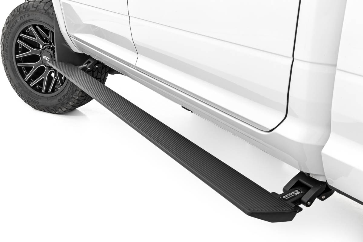 - Step Up with Confidence: Rough Country's Power Running Boards are the next evolution in vehicle access, blending rugged functionality with sleek styling. These electric, retractable E-Boards automatically extend when the door opens and tuck tight against the body when closed, delivering a clean, low-profile look. A textured, anti-slip coating ensures a firm grip in any weather, while integrated LED lights illuminate the step area for safe entry and exit, day or night. Built to Handle It All: Crafted from lightweight yet tough 6" aluminum, these all-season steps are made to withstand the elements and daily use. Each board supports up to 660 lbs. per side, making them ideal for work, play, or overland adventures. Dual-motor technology guarantees smooth and dependable movement, while the automatic 'SAFE-STOP' safety feature halts operation if an obstruction is detected. A built-in interior bypass switch gives you manual control whenever you need it. Protection with Purpose: When retracted, the E-Boards sit tight against the rocker panel, acting as a protective barrier against rocks and debris while enhancing your ride's streamlined appearance. Whether you're navigating city streets or backcountry trails, these steps add functionality and defense in one smart package. Simplified Installation: Rough Country makes installation straightforward with a bolt-on design and included hardware. While minor drilling is required, you'll get a secure, factory-style fit that blends seamlessly with your vehicle. Peace of Mind Guaranteed: Every set of Power Running Boards is backed by Rough Country's 5-year limited replacement warranty, covering structural and workmanship defects. Trust in proven durability and ride with confidence.