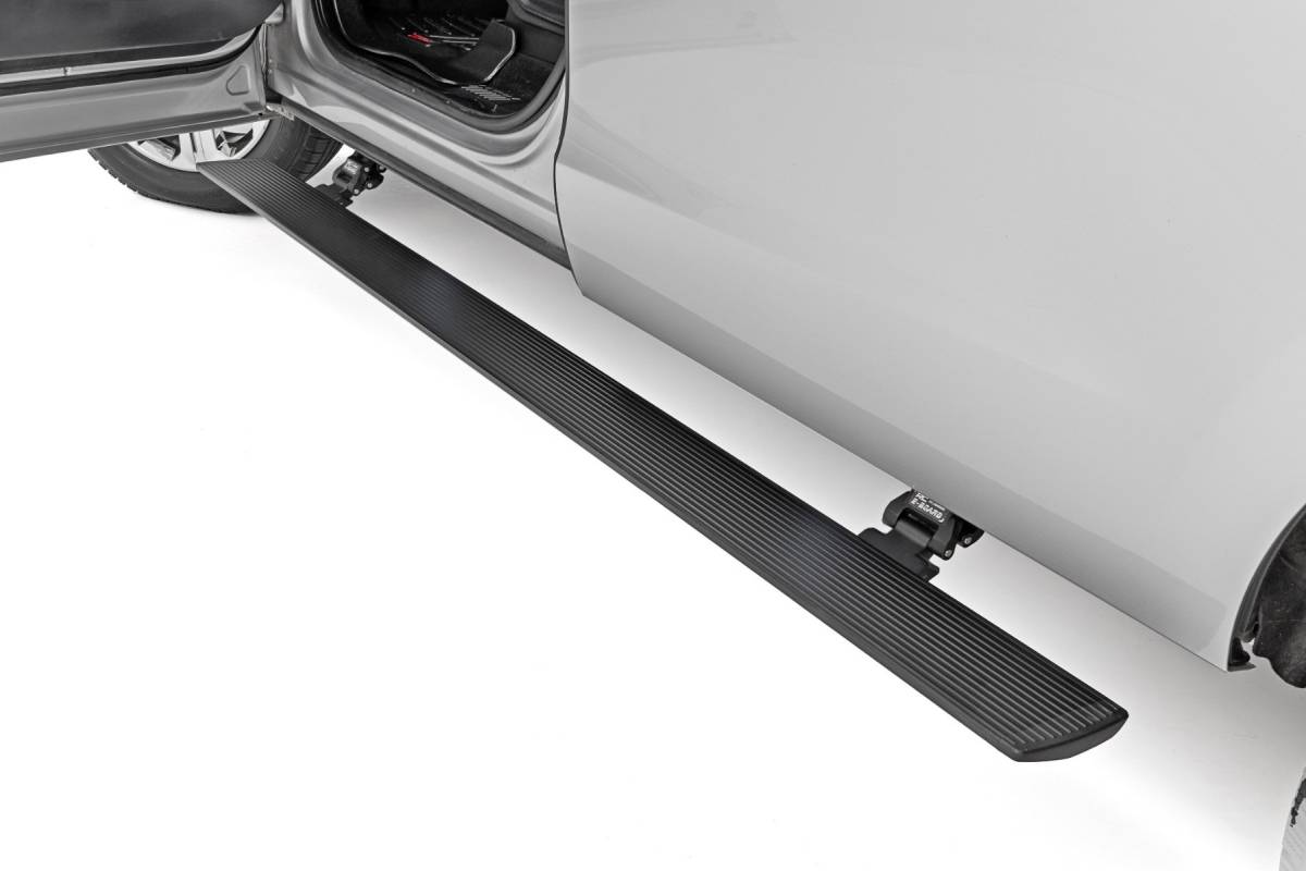 - Step up in style. Sidesteps have come a long way, and now we've taken them to the next level with Rough Country's Power Running Boards! These retractable E-Boards tuck tight for a clean look when not in use and automatically extend when the door is opened. With an anti-slip surface that provides a secure stepping area, getting in and out of your ride has never been easier. Our Power Running Boards also include LED lights that provide illumination when deployed and shut off when steps are closed, providing a sleek, aerodynamic look. Premium Construction. The Rough Country E-Board Steps combine durability, strength, and style. These 6" all-season steps are made from lightweight yet durable aluminum and can support up to 660 lbs. per side. Equipped with dual motor technology, these steps can handle anything Mother Nature throws their way. They feature an automatic 'SAFE-STOP' mechanism that engages if a blockage is detected and include an interior bypass switch for manual override. So whether you're heading out on a weekend errand or loading up for a camping trip, our electric steps offer reliable protection for all your adventures. Installation. These easy-to-install steps are the perfect solution for getting in and out of your vehicle. No drilling is required for installation, and the steps tuck tight under the rocker panel when not in use. Don't struggle to get in and out of your vehicle anymore. Make life easier with Rough Country's Power Running Boards. Warranty. Rough Country backs its products with a limited lifetime replacement warranty. Our products are protected from structural and workmanship damage after purchase. Our industry-leading warranty gives you peace of mind when using Rough Country products!