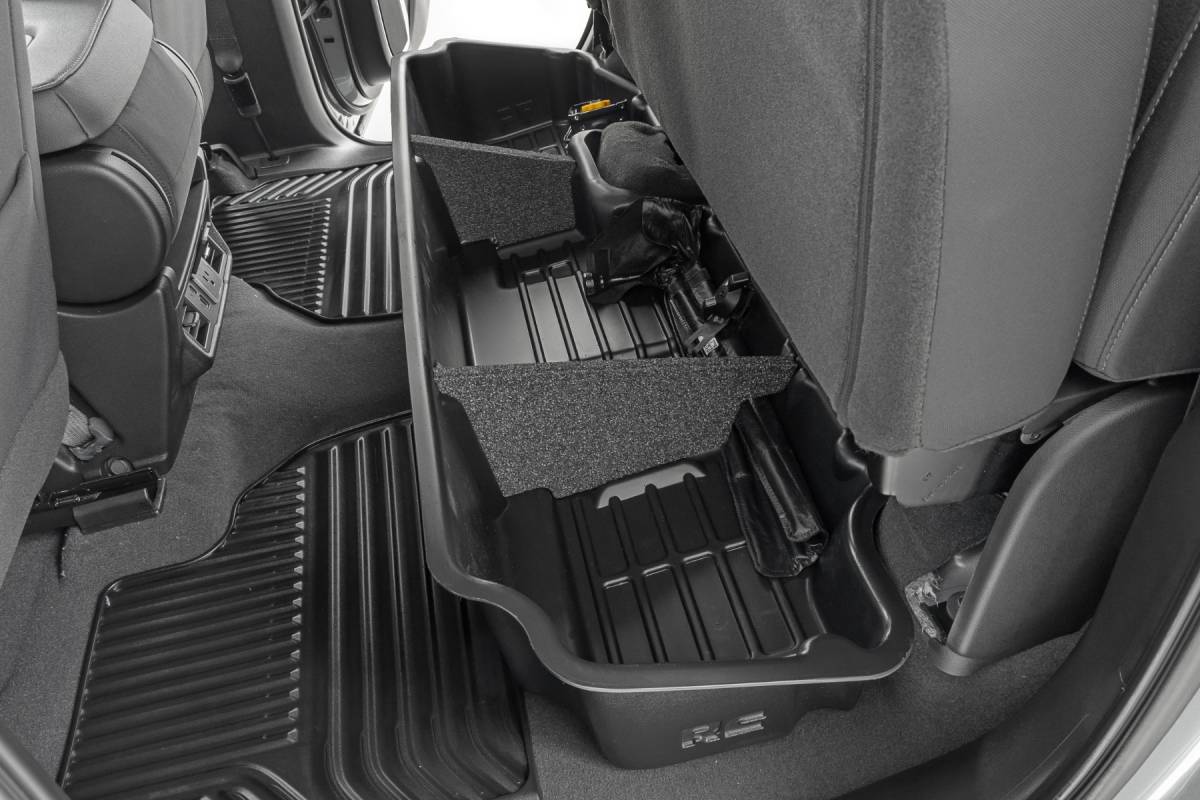 - Clean up the contents of your cab with Rough Country's Custom-Fit Under Seat Storage Compartment. These handy underseat truck storage compartments offer an easy way to store your gear with a custom, contoured look that blends in seamlessly with your vehicle's factory design. Keep your tools, gear, and other odds and ends organized and stowed away while conveniently stowed away under the rear seats. Each under-seat storage tray is constructed from a durable, high-density thermoplastic material that s built to withstand kicks, nicks, and corrosion. A convenient anti-skid surface helps prevent the contents of your underseat cargo tray from rolling around while driving. Best of all, Rough Country's Custom-Fit Under Seat Storage Compartments are easy to install, so you can upgrade your cargo management quickly and easily!