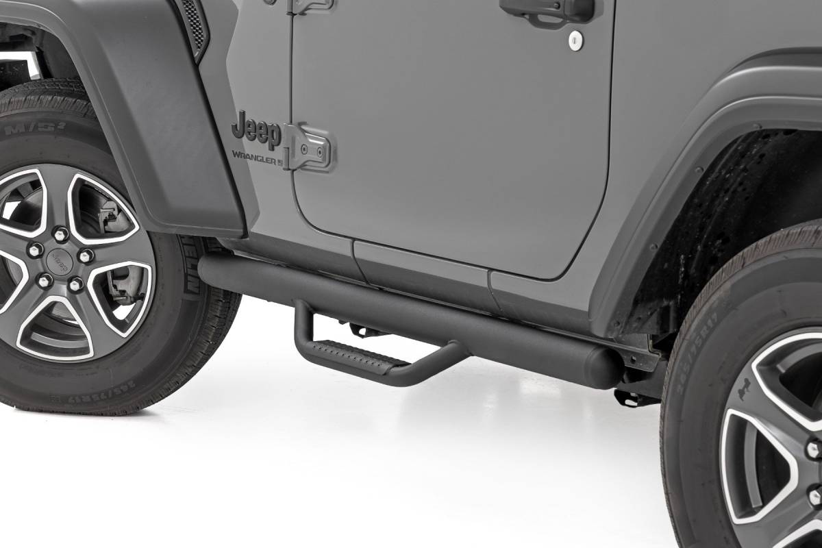 - Climbing into your Jeep should never feel like a workout. With Rough Country's all-new bolt-on Nerf Steps, getting in and out is a breeze. Experience effortless access and elevate your Jeep with a sleek, durable upgrade. Enhanced Undercarriage Protection: Say goodbye to road debris, rocks, and obstacles that could damage your undercarriage. Our Nerf Steps act as a shield, protecting your vehicle from the harsh elements below. Integrated Stone Guards for Added Protection: Keep your Jeep Wrangler looking like new. The built-in stone guards effectively deflect kicked-up rocks and debris, preserving your vehicle's paint job from potential damage. Sleek, Streamlined Design: No bulky bars here, just a clean, high and tight profile that follows your cab's contours. These Nerf Steps provide a polished, streamlined look that enhances your Jeep's rugged yet refined style. Built to Endure: Crafted from .084 wall, corrosion-resistant tubing, these Nerf Steps are engineered to withstand anything the road or trail throws at them. From muddy trails to harsh environments, they'll handle it all while staying tough and reliable. Quick and Easy Installation: No drilling required, just bolt them on and enjoy a hassle-free installation. Spend less time working and more time exploring with this straightforward, user-friendly design. Limited Lifetime Warranty: Backed by Rough Country's Limited Lifetime Warranty, these Nerf Steps provide lasting durability and peace of mind for years to come. Step up your Jeep's style and protection with Rough Country Nerf Steps. Easy installation, superior defense, and a sleek, high-end design, everything you need to take your vehicle to the next level.