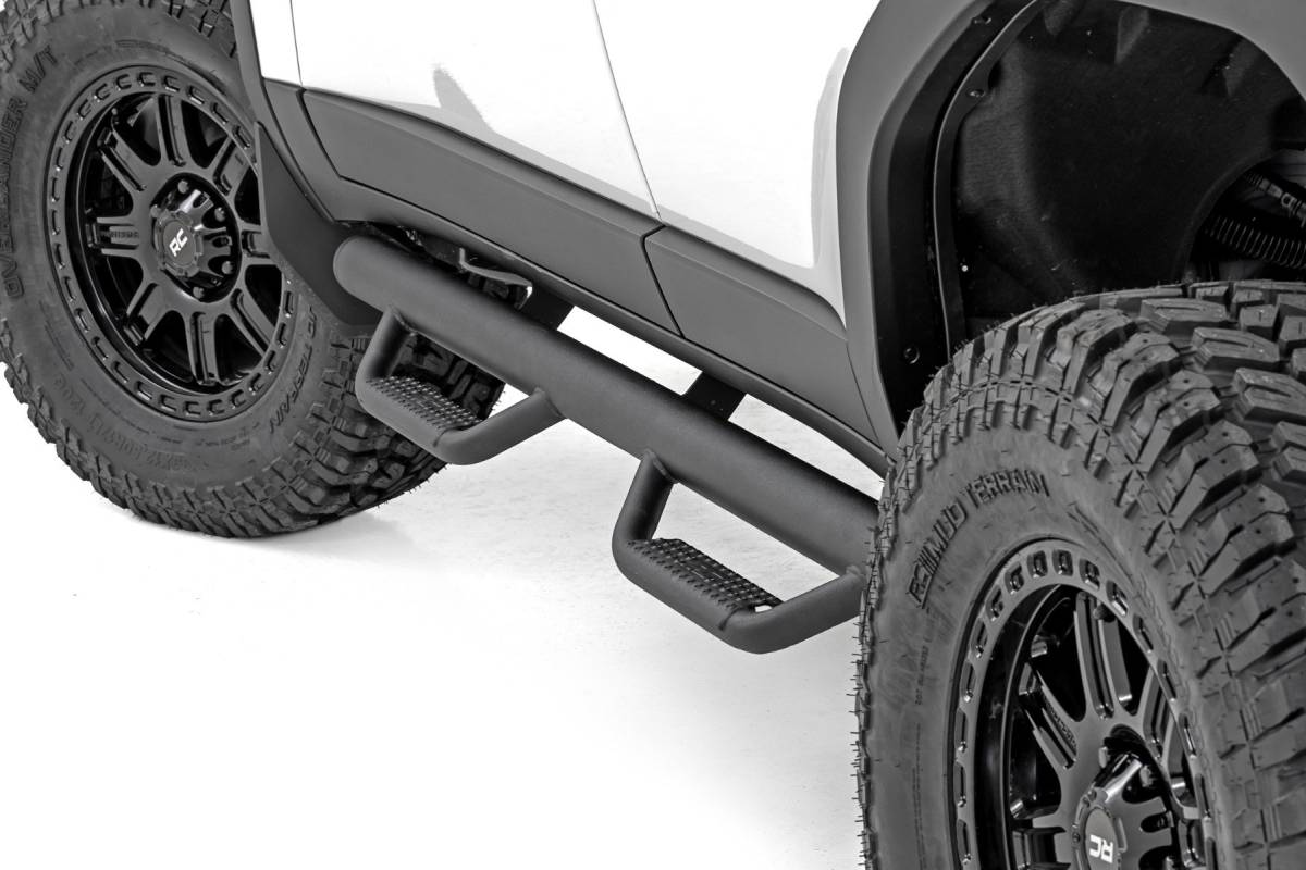 - Climbing into your Toyota Land Cruiser should never feel like a workout. With Rough Country's all-new bolt-on Nerf Steps, getting in and out is a breeze. Experience effortless access and elevate your Land Cruiser with a sleek, durable upgrade. Enhanced Undercarriage Protection: Say goodbye to road debris, rocks, and obstacles that could damage your undercarriage. Our Nerf Steps act as a shield, protecting your vehicle from the harsh elements below. Integrated Stone Guards for Added Protection: Keep your Land Cruiser looking like new. The built-in stone guards effectively deflect kicked-up rocks and debris, preserving your vehicle's paint job from potential damage. Sleek, Streamlined Design: No bulky bars here, just a clean, high and tight profile that follows your cab s contours. These Nerf Steps provide a polished, streamlined look that enhances your Land Cruiser's rugged yet refined style. Built to Endure: Crafted from .084 wall, corrosion-resistant tubing, these Nerf Steps are engineered to withstand anything the road or trail throws at them. From muddy trails to harsh environments, they ll handle it all while staying tough and reliable. Quick and Easy Installation: No drilling required, just bolt them on and enjoy a hassle-free installation. Spend less time working and more time exploring with this straightforward, user-friendly design. Limited Lifetime Warranty: Backed by Rough Country's Limited Lifetime Warranty, these Nerf Steps provide lasting durability and peace of mind for years to come. Step up your Toyota Land Cruiser s style and protection with Rough Country Nerf Steps. Easy installation, superior defense, and a sleek, high-end design, everything you need to take your vehicle to the next level.
